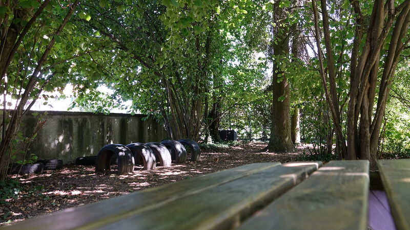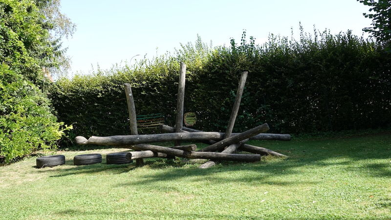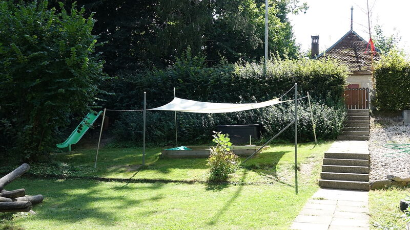 Geräumiger, mit Sonnensegel überdachter Sandkasten, in dem die Kinder bis zu einem Meter tief graben können. Zudem gibt es einen tollen Spielbereich mit Klettergerüst und Rutsche. In den Hochbeeten haben die Kinder die Möglichkeit, selbstständig zu pflanzen und zu gärtnern.