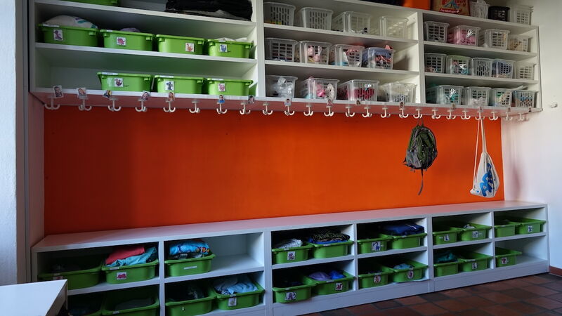 Die Garderobe bietet Platz für täglich bis zu 28 Kinder. In den persönlichen Boxen können Ersatzkleider, aber auch z.B. schöne erstellte Bastelarbeiten verstaut werden.
